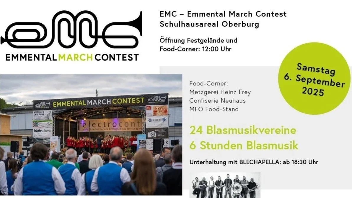 Bereits zum fünften Mal trifft sich im kommenden September die Blasmusikszene in Oberburg zum Emmental March Contest, kurz EMC. 25 Windband- und Brassband-Vereine haben sich für den Wettbewerb angemeldet und messen sich am 6. September 2025 in vier Kategorien. Schon am Freitag startet das Blasmusikwochenende mit «Emmental in Concert».